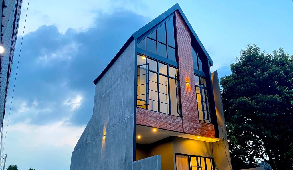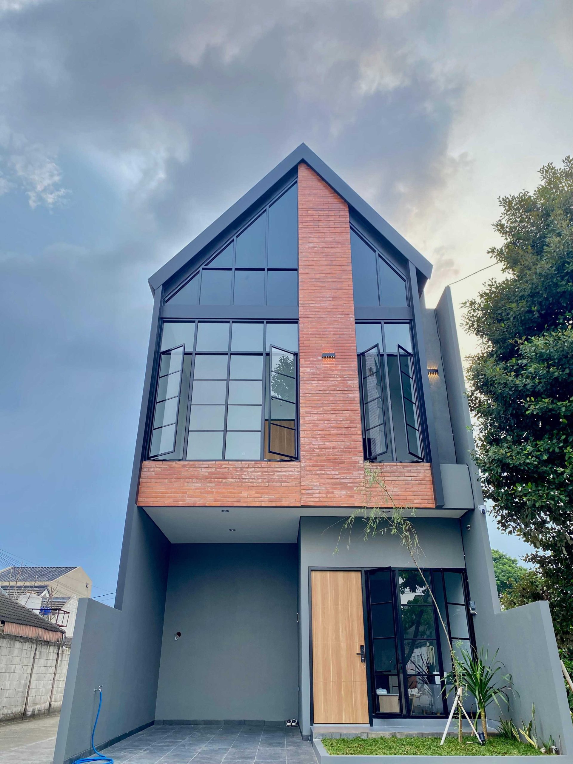 Gaya arsitektur minimalis dengan aksen bata merah, warna netral, jendela besar, dan material ramah lingkungan.